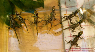 Nachzucht:Paarungszeit ist im Herbst (ab August); die Tiere sind lebendgebärend (etwa zwischen Januar und Mai); Anzahl Junge 6-16 (auch schon mal bis zu 26)Futter:hauptsächlich Insekten unterschiedlichster Art, ergänzend nehmen sie auch pflanzliches Futter an.Sonstiges: Der blaue Stachelleguan ist der größte bekannte Stachelleguan. Er zählt auch mit zu den am häufigsten gehaltenen Stachelleguanen. Blaue Stachelleguane können in Gruppen von einem Männchen mit mehreren Weibchen gehalten werden. Anmerkung: Niemals ausgewachsene Männchen in einem Terrarium zusammen halten. Das geht nicht gut. Auch unter den Weibchen kann es Ärger geben. In diesem Fall sollten diese ebenfalls getrennt gehalten werden, denn das unterdrückte Tier würde auf Dauer eingehen. Die Tiere haben einen starken Fluchtinstinkt und lassen sich nicht freiwillig anfassen. Sie werden aber ansonsten relativ schnell zutraulich und nehmen Futter auch aus der Hand.